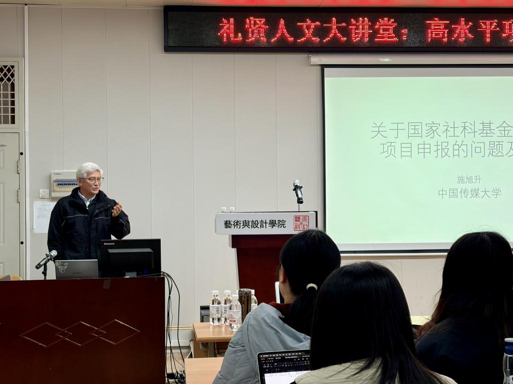 12月12日下午,礼贤人文大讲堂第一百零四讲在艺术与设计学院举办。中国传媒大学艺术研究院施旭升教授应邀作了题为“高水平项目申报与论文写作指导”的学术讲座。讲座由人文社科处主办,艺术与设计学院承办,艺术与设计学院青年骨干教师及部分研究生参加了讲座,讲座由丁南副院长主持。
